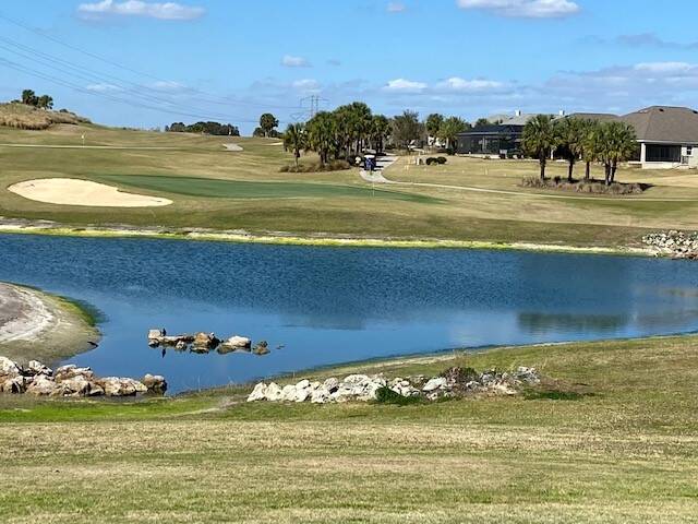 Your opening drive is downhill over a trap - but it shouldn’t affect your shot because it’s not that close to the green. Don’t be long though because the downhill descent continues after the green. #2 is a harder shot because the green is perched between a large trap on the left and a drastic downslope on the right. The 3rd hole looks like Frankenstein - long and unattractive with a few bolts showing. It’s 182 yards long, a bit downhill, with nothing much else going on. It qualifies for my Hardest Holes list simply on length. After trying to bring that monster hole to life, move on to #4. Avoid the sand magnet on the right side for your best chance at a par. Now flip it around and head back north. Interestingly, the 4th and 5th hole are exactly the same yardage from the gold tees. But because they play in precisely opposite directions, your club selection and aim are completely dependent on the wind. The ride between 4 and 5 also bring you under the power lines for the second time today. The prominence of the power lines can be a distractor for some, but it's a better use of land than just scrub brush. In fact, six Villages Exec courses are built under power lines. Can you name the other five? (Quiz Question 14)